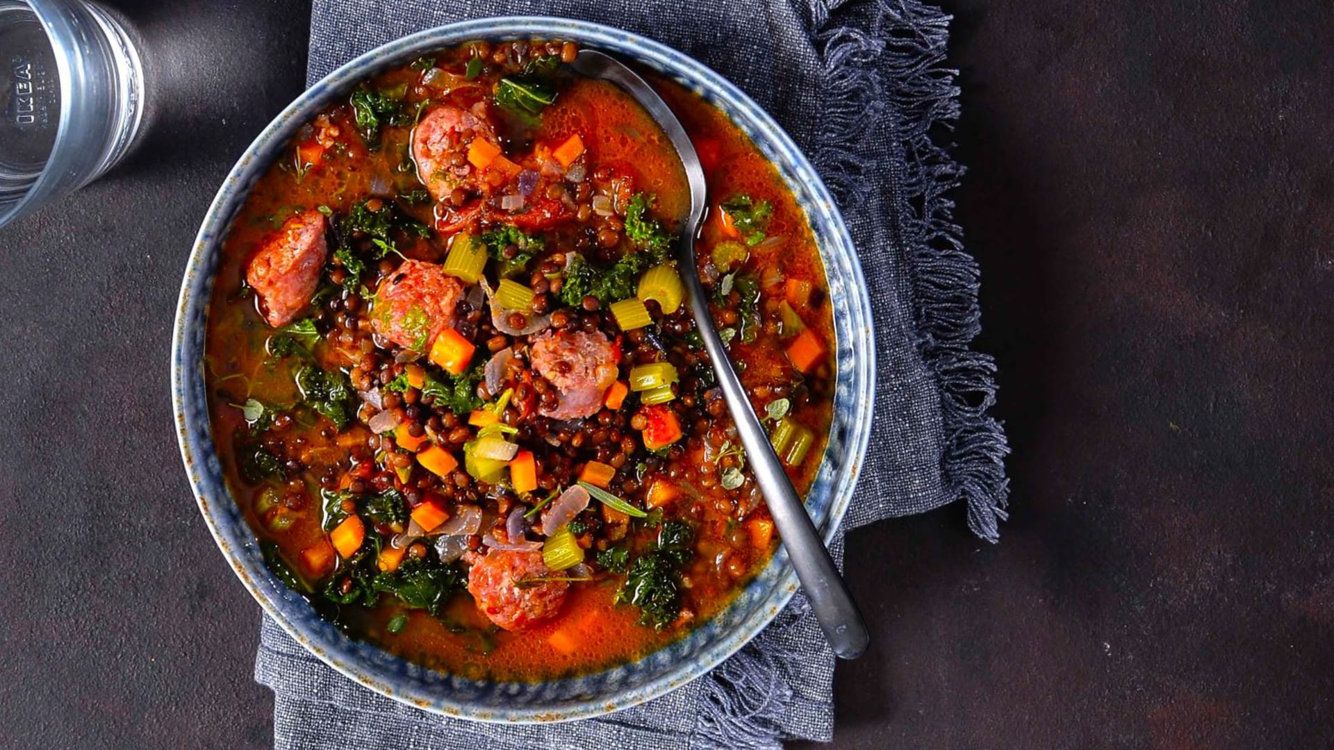 Polévka z drobnozrnné čočky puy se zeleninou a knedlíčky z čerstvé klobásy