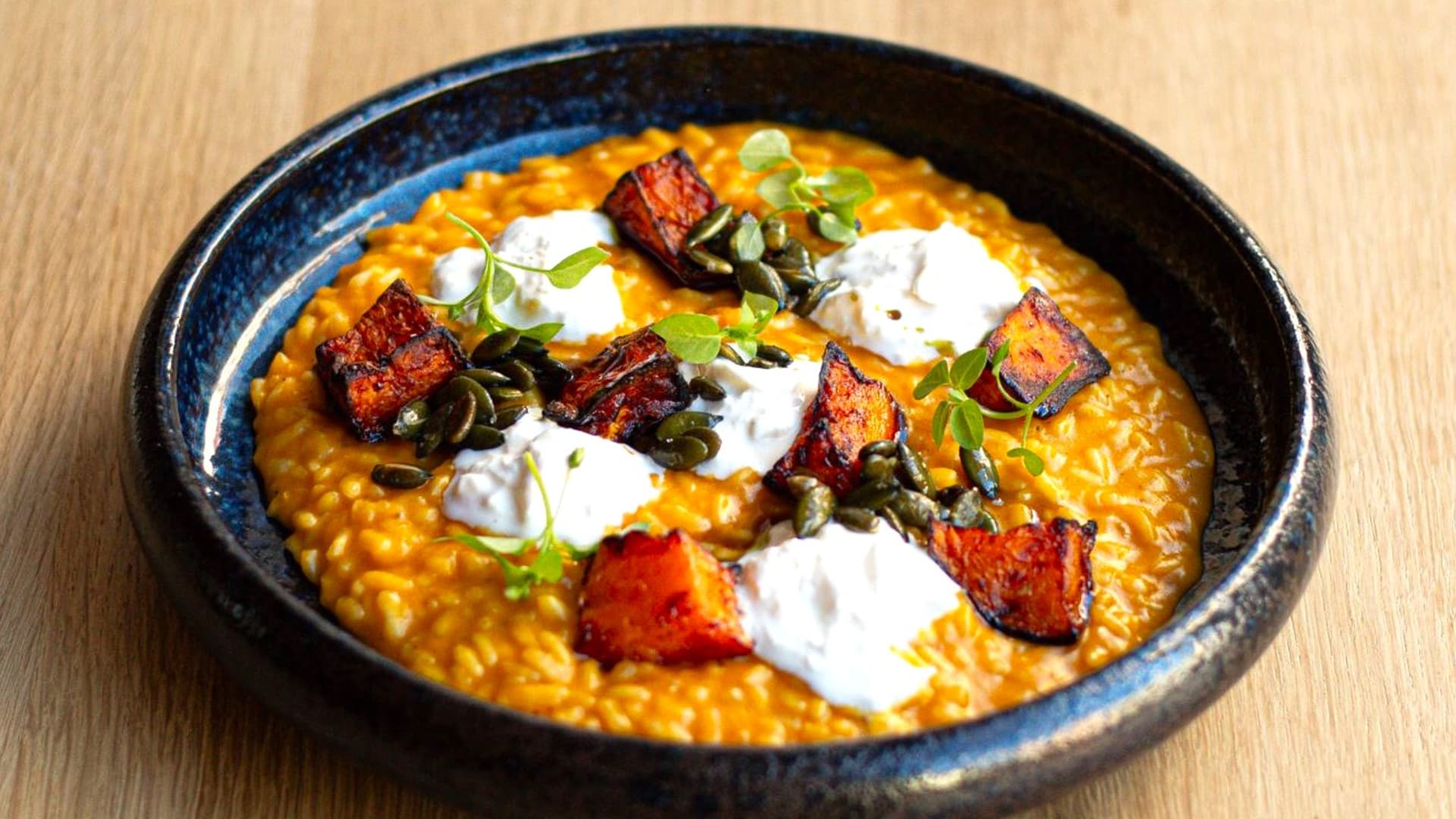 Dýňové risotto s pečenou dýní, dýňovými semínky a stracciatellou podle Radka Davida z Vinografu