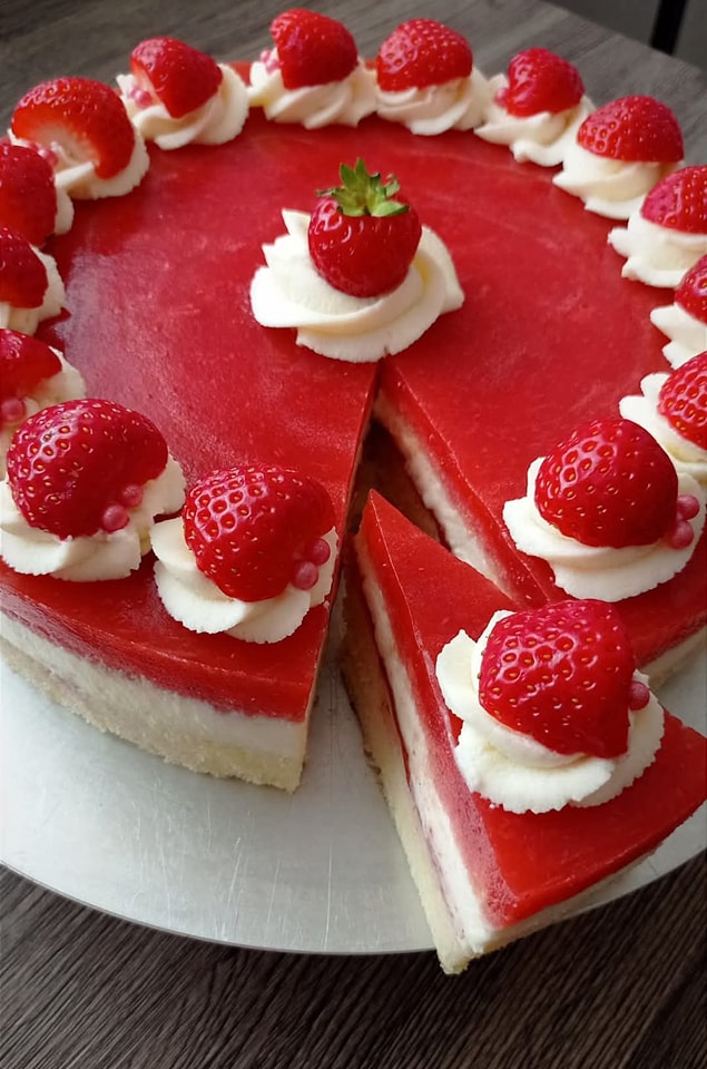 (Korpus podle Reny Naty) Ingredience: Korpus: 6 vajec 240 g krupicového cukru 6 lžic oleje Špetka soli 240 g hladké mouky Náplň a krém: Jahodová marmeláda Rum (na pokapání korpusu) 2 smetany ke šlehání (33% tuku) 2x Mascarpone (vanilkové) Moučkový cukr (dle chuti) 1 ztužovač šlehačky Čerstvé jahody Cukr (na rozvaření jahod) Jahodová galaretka Postup:
