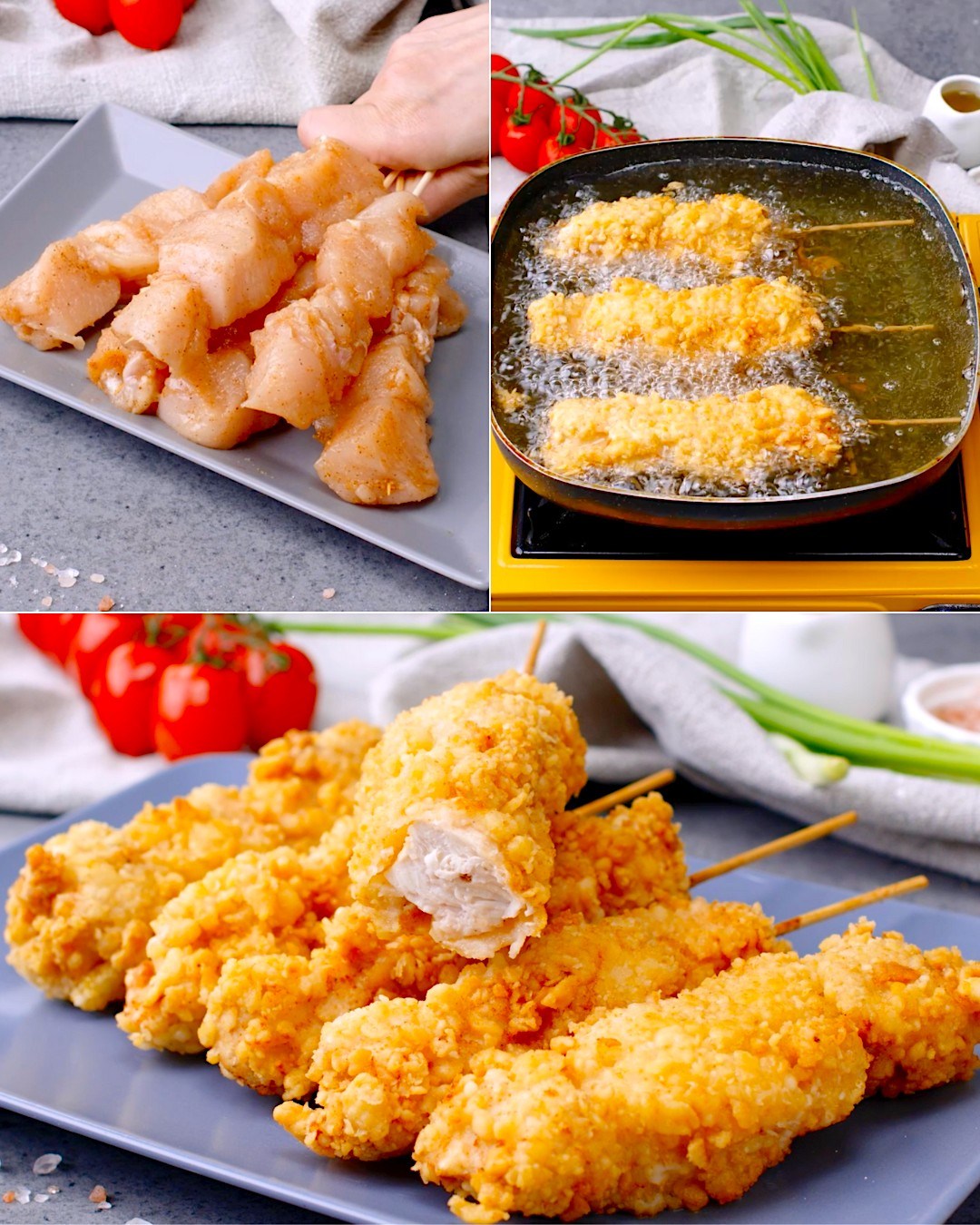 Kuřecí špízy: uvnitř jemné, zvenku křupavé! INGREDIENCE 2 kuřecí prsa 5 g (1/2 lžičky) česnekového prášku 1 lžička mleté červené papriky 4 g (1 lžička) soli 1/2 lžičky černého pepře 30 ml (2 lžíce) vody 120 g (3/4 šálku) mouky 120 g (3/4 šálku) kukuřičného škrobu 5 g prášku do pečiva Sýrový kořenící prášek 5 … Lire plus