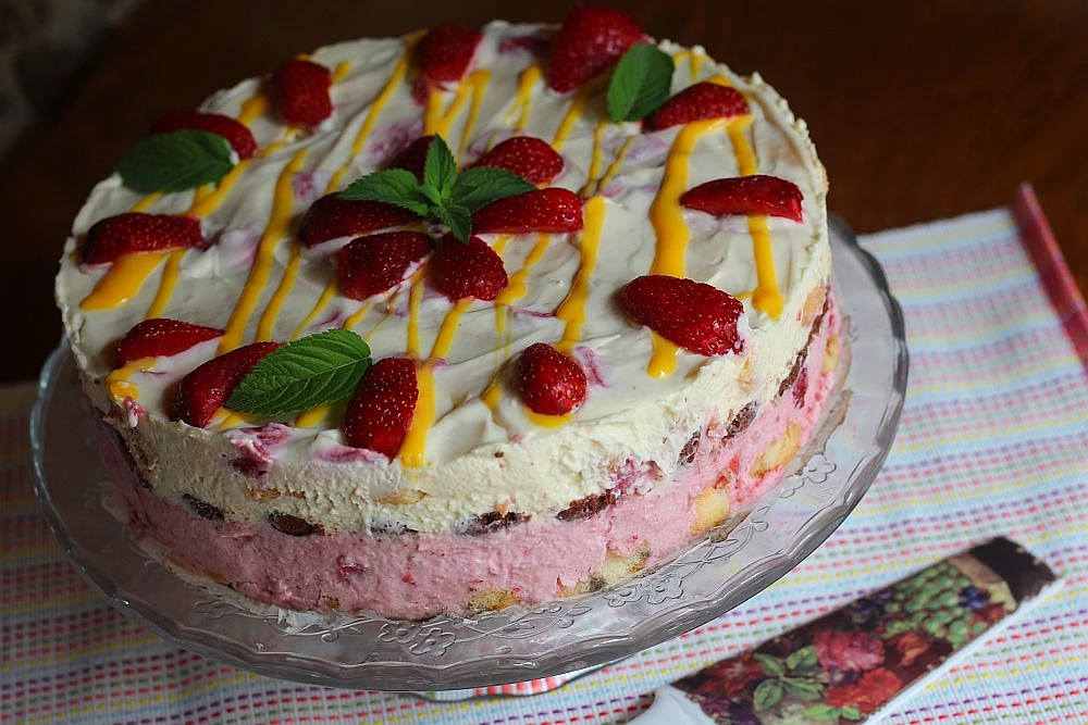 Kombinace smetany, jahod, kávy, rumu a vaječného likéru slibuje nevšední chuťový zážitek. Dva druhy krému vrstvíme do dortové formy a prokládáme cukrářskými a kakaovými piškoty. Hotový ho můžeme ještě dozdobit vaječným likérem a jahodami.