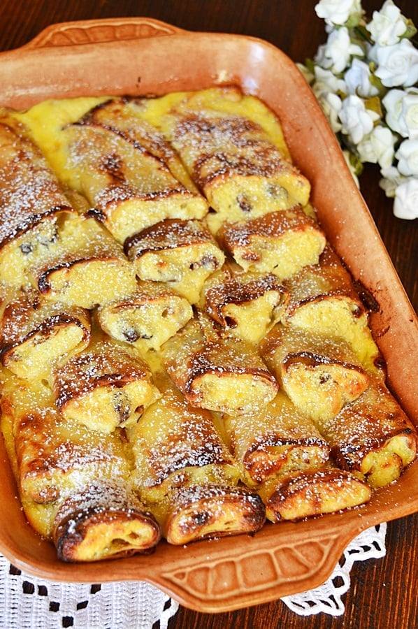 Pro přípravu potřebujete běžné suroviny: mléko, vejce, mouku, cukr, vanilkový cukr, tvaroh, citronovou kůru a rozinky. Palačinky usmažíte dozlatova, naplníte směsí z tvarohu, žloutků, cukru a rozinek, srolujete, vložíte do máslem vymazaného pekáče a přelijete domácí vanilkovou omáčkou. Krátké zapečení v troubě zaručí dokonalou chuť i konzistenci.