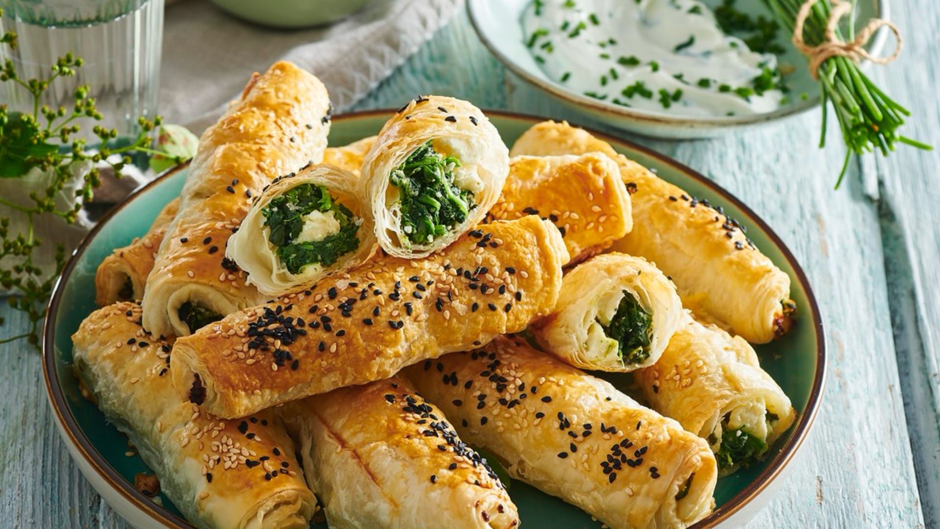 Křehké závitky plněné špenátem a balkánským sýrem skvěle doplní jogurtový nebo pikantní rajčatový dip. Ideální volba pro pohoštění na párty nebo lehkou večeři. Jejich příprava je velice jednoduchá a výsledek parádní!