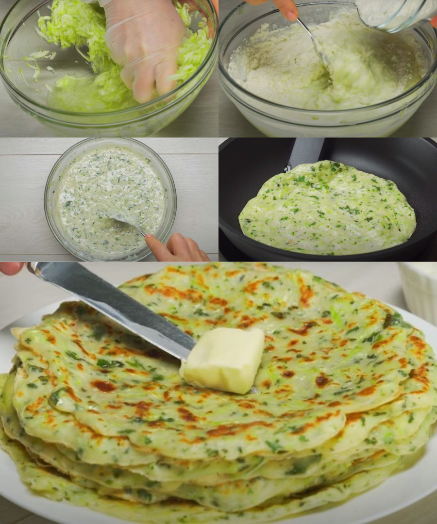 🔄 Příprava: Smíchejte cuketu, vejce, kefír, petržel a sůl. Přidejte mouku do hladka, poté přidejte olej a jedlou sodu. Nechte 20 minut odpočinout.